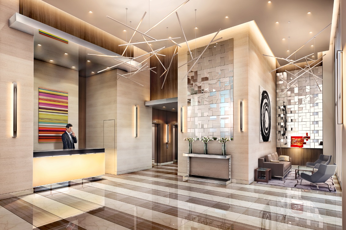 • Elegant double-height marble- clad lobby